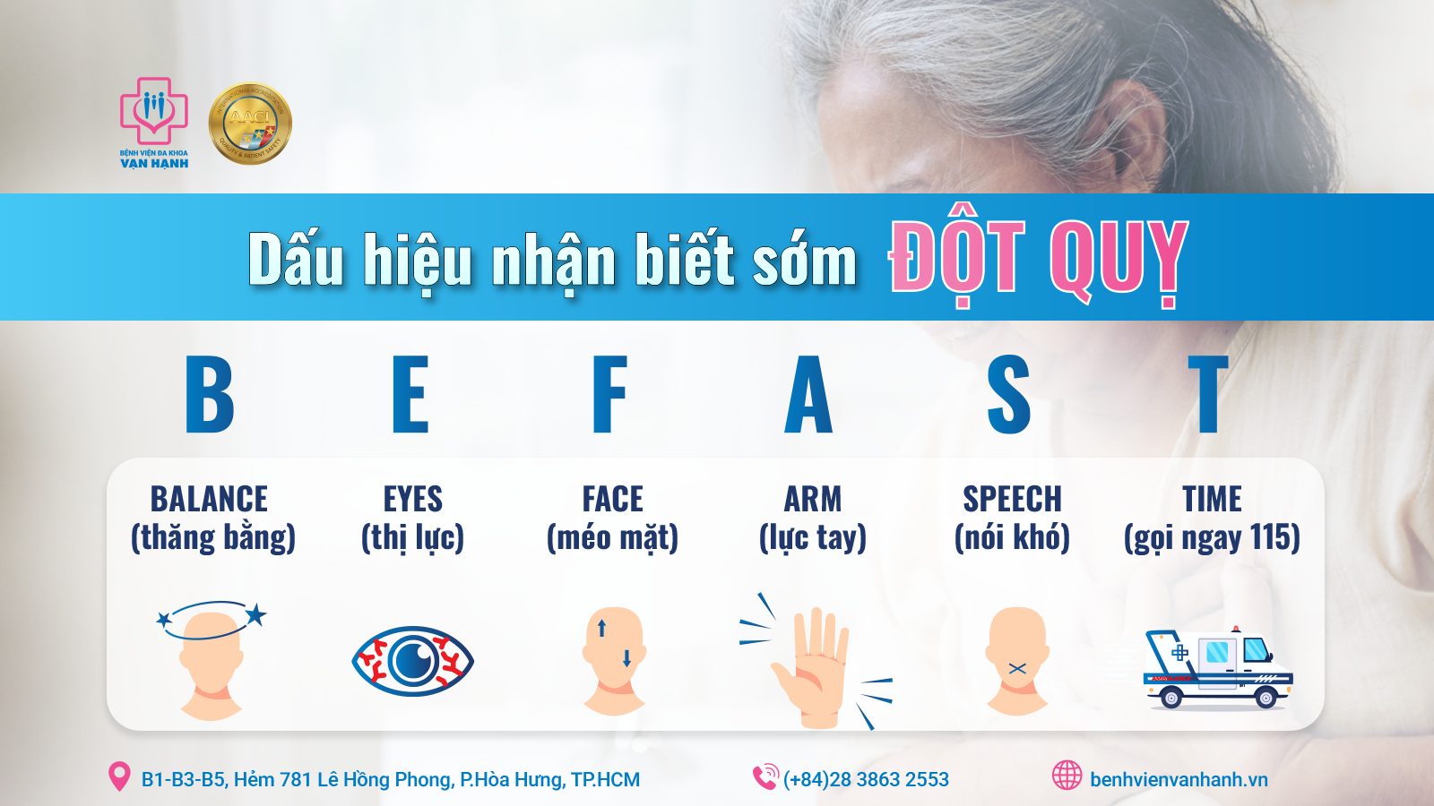 Để giúp mọi người dễ dàng nhận biết đột quỵ, các chuyên gia và tổ chức y tế thế giới khuyến nghị áp dụng quy tắc BE FAST – bộ quy tắc giúp phát hiện các triệu chứng ĐỘT QUỴ điển hình một cách đơn giản và hiệu quả: