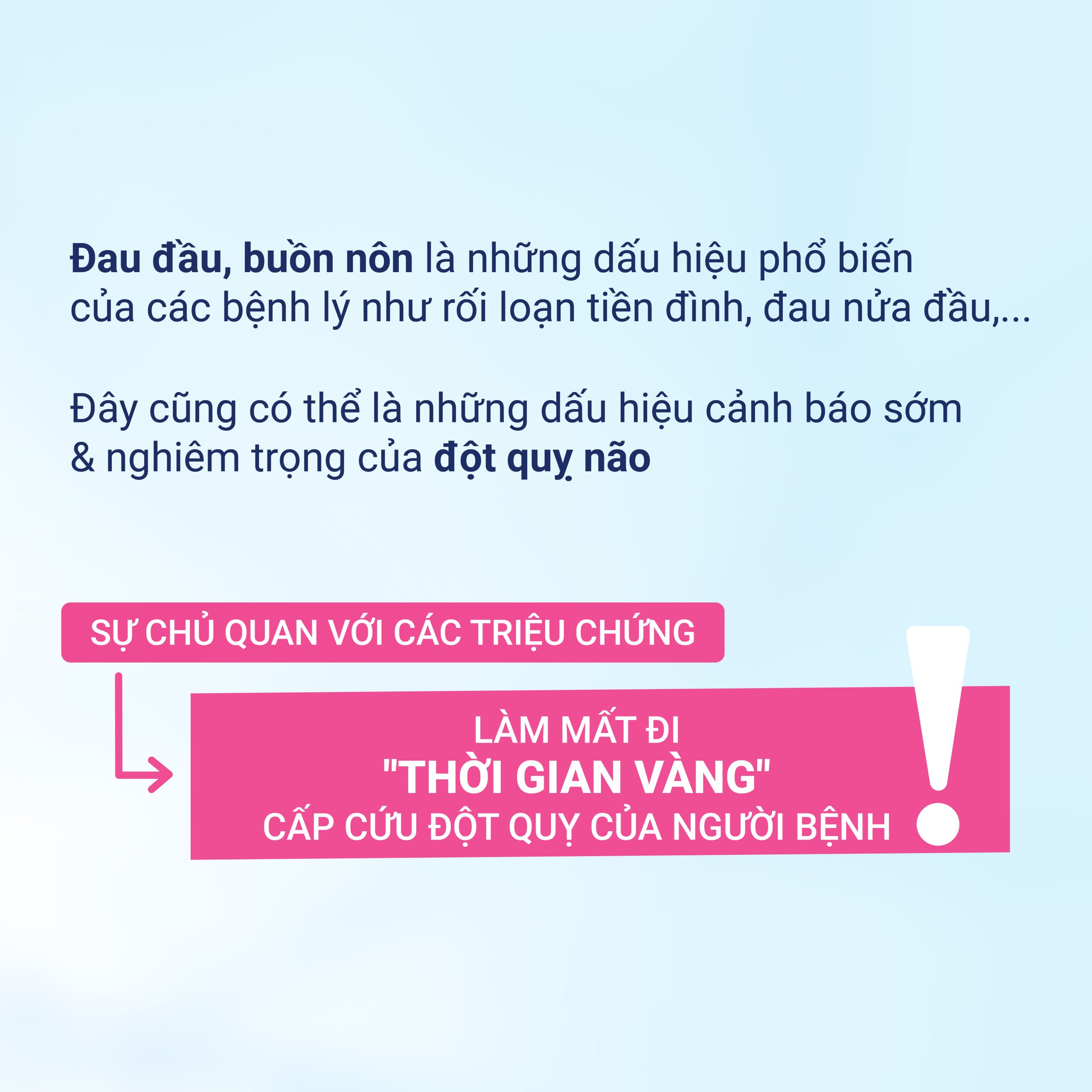 Đột quỵ não là một cấp cứu y khoa khẩn cấp. “Thời gian là não”: mỗi phút trôi qua, hàng triệu tế bào não sẽ chết đi nếu không được tái tưới máu kịp thời. Do đó, nếu bệnh nhân xuất hiện cơn đau đầu đột ngột, dữ dội kèm buồn nôn, nôn ói, đặc biệt là ở những người có yếu tố nguy cơ (cao huyết áp, tiểu đường, lớn tuổi), cần thực hiện ngay lập tức các bước sau: