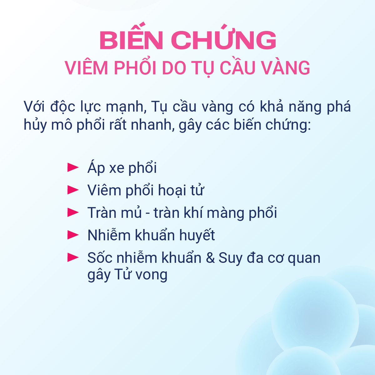 Với độc lực mạnh, tụ cầu vàng có khả năng phá hủy mô phổi rất nhanh, gây ra các biến chứng nặng nề và có thể đe dọa tính mạng chỉ trong thời gian ngắn: