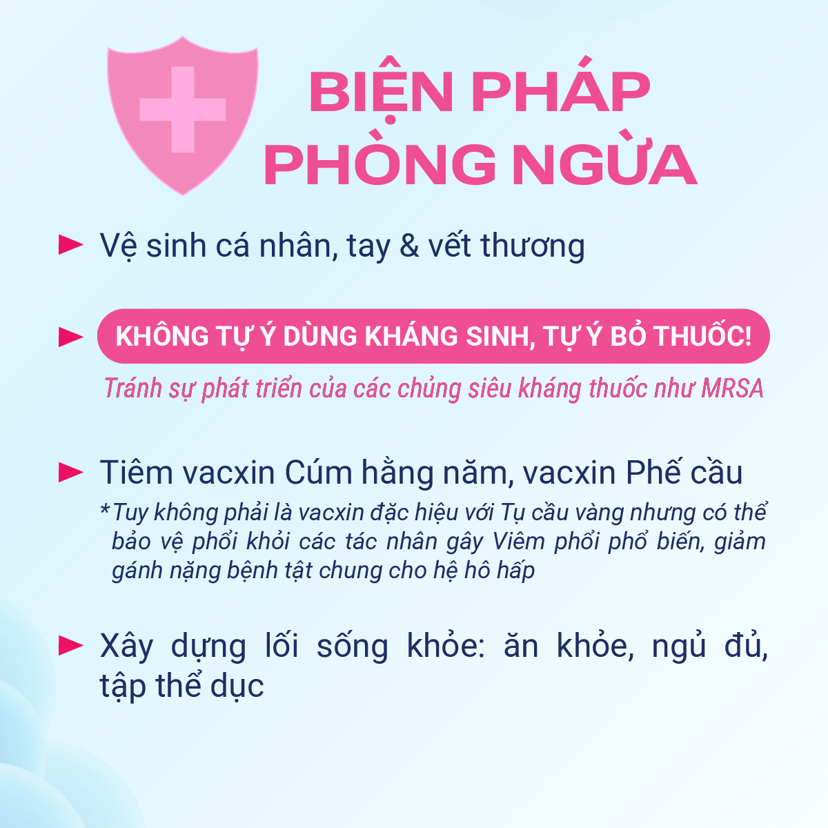 - Tiêm vacxin Cúm hàng năm: là biện pháp quan trọng nhất. Vì viêm phổi tụ cầu vàng thường là biến chứng xảy ra sau khi bị cúm, việc phòng ngừa cúm sẽ giảm đáng kể nguy cơ mắc bệnh nặng.