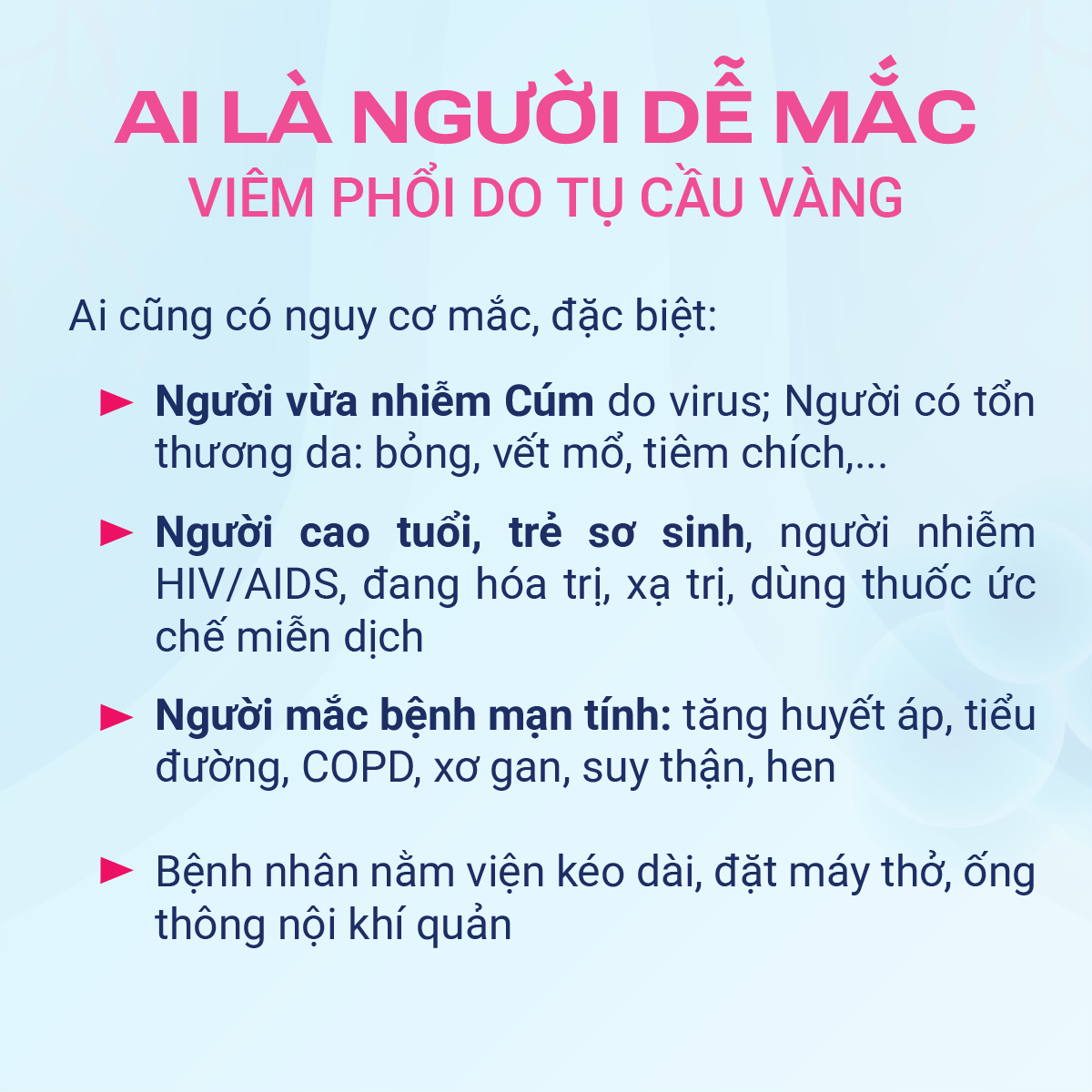 Bất kỳ ai cũng có thể mắc viêm phổi do tụ cầu vàng, nhưng một số nhóm đối tượng sau đây có nguy cơ mắc cao hơn hẳn: