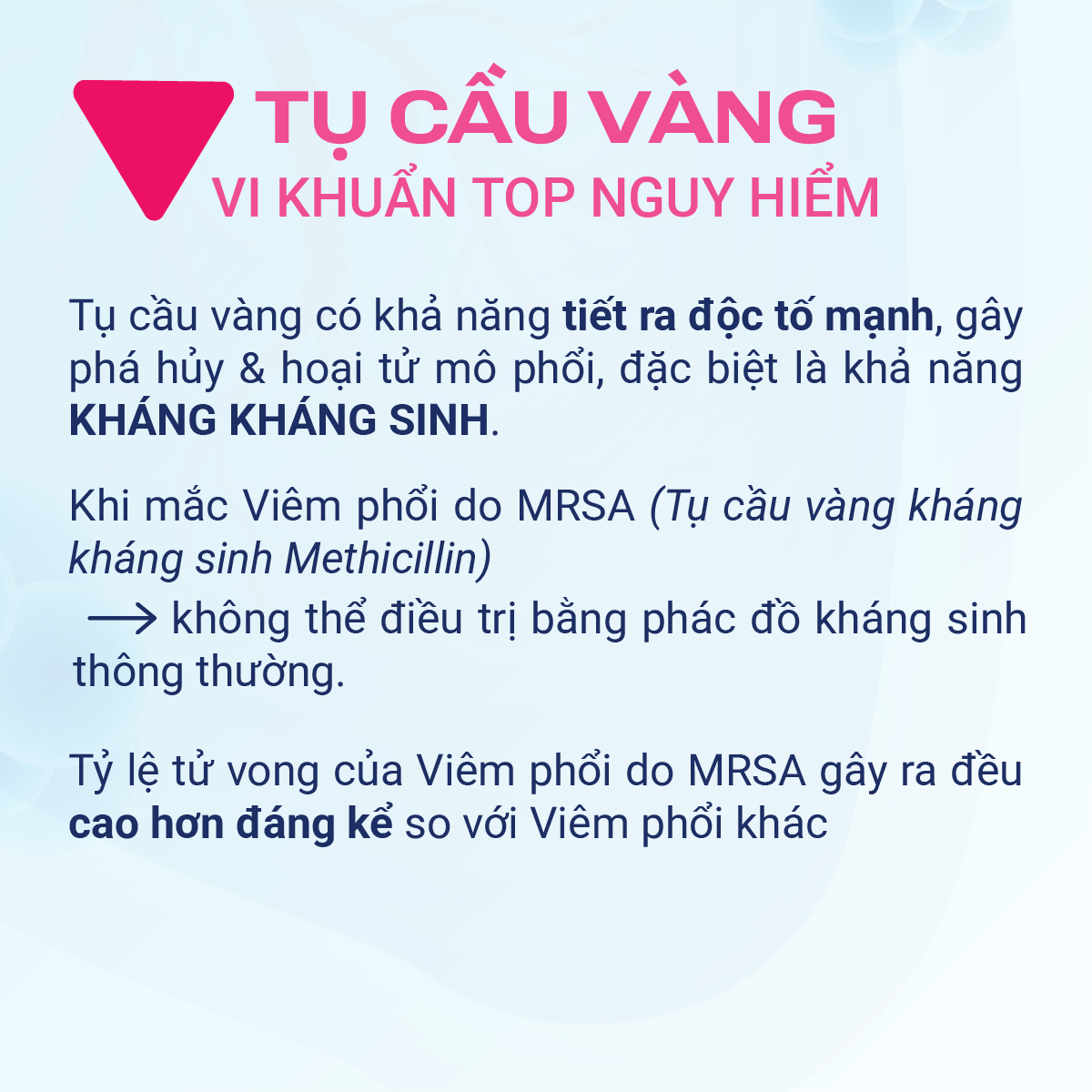 Viêm phổi là tình trạng nhiễm trùng nghiêm trọng tại phổi, và một trong những tác nhân đáng sợ nhất gây ra bệnh lý này chính là vi khuẩn Staphylococcus aureus, hay còn gọi là Tụ cầu vàng. Đây là loại viêm phổi do vi khuẩn có độc lực rất cao, bệnh thường diễn biến nhanh, rầm rộ và có nguy cơ tử vong cao nếu không được can thiệp kịp thời.