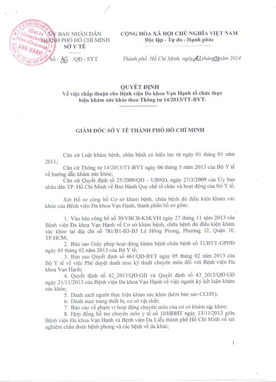 - Bệnh viện Đa khoa Vạn Hạnh đã được phép khám và cấp giấy chứng nhận sức khỏe theo thông tư 14/2013/TT-BYT của Bộ trưởng Bộ Y tế.